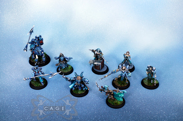 Here is a group shot of Retribution of Scyrah painted as Tron Theme. Includes Fane Knight Skeryth Issven, mounted and on foot, House Shyeel Magister, Lord Arcanist Ossyan, Eiryss Angel of Retribution, Eiryss Mage Hunter of Ios, Adeptis Rahn, Madelyn Corbeau Ordic Cortesan, and Arcanist